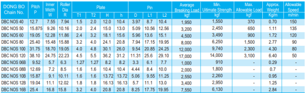 • Tải trọng phá vỡ tương tự như xích con lăn tiêu chuẩn Dong Bo